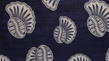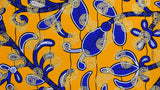 La combinación de motivos naranja sobre fondo azul eléctrico resulta muy popular en África y menudo se encuentra en los tejidos wax. En este estampado, el dibujo es una pequeña flor de cinco pétalos estilizados.