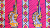 El diseño de cuernos de cabra enfrentados, interpretado en fucsia en esta tela, pertenece al repertorio de símbolos ‘adinkra’, base de un sistema de comunicación que los Ashanti de Ghana crearon hace siglos.