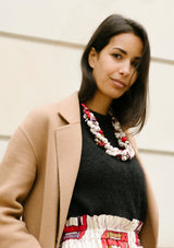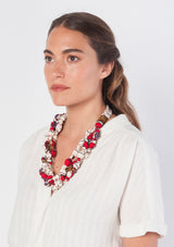 Vibrante y atrevido en su combinación de tonos amarillo, rojo y azul marino sobre fondo blanco, este estampado floral recuerda el origen indonesio de las telas wax.