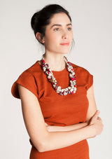 El gusto de los habitantes del norte de Nigeria por los tejidos claros y los decorados geométricos sirvieron de inspiración para el diseño de este estampado de cubos rojos, marrones y morados.