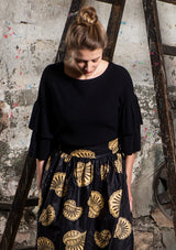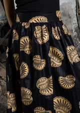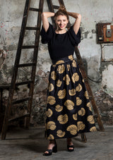 Larga falda vaporosa. Cintura ancha y ajustable de talle alto. Bolsillos laterales y forro interior