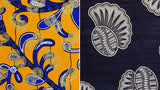 La combinación de motivos naranja sobre fondo azul eléctrico resulta muy popular en África y menudo se encuentra en los tejidos wax. En este estampado, el dibujo es una pequeña flor de cinco pétalos estilizados.