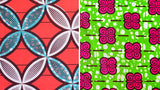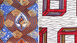 Este estampado de fondo rojo vibrante presenta motivos de aspas azules y blancas que, combinadas, forman círculos que se repiten al infinito. Muy popular en África occidental, este tipo de diseños geométricos se encuentran en muchos repertorios decorativos tradicionales, como el de los Igbo de Nigeria o el de los Kasena de Burkina Faso, por dar solo dos ejemplos.