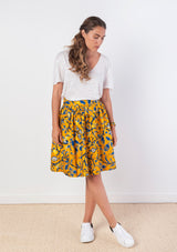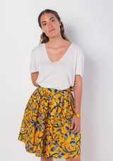 Vibrante y atrevido en su combinación de tonos amarillo, rojo y azul marino sobre fondo blanco, este estampado floral recuerda el origen indonesio de las telas wax.