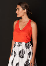Vibrante y atrevido en su combinación de tonos amarillo, rojo y azul marino sobre fondo blanco, este estampado floral recuerda el origen indonesio de las telas wax.
