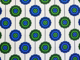 Muy popular en África occidental, el motivo declinado en verde y azul de esta tela se conoce como “record” o “gramophone disc” en los países de habla inglesa por su similitud con un disco. En los países francófonos se llama “Suzanne”, aunque se desconoce quien fue la mujer de la que tomó el nombre.