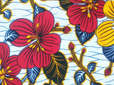 Vibrante y atrevido en su combinación de tonos amarillo, rojo y azul marino sobre fondo blanco, este estampado floral recuerda el origen indonesio de las telas wax.