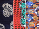 Este estampado de fondo rojo vibrante presenta motivos de aspas azules y blancas que, combinadas, forman círculos que se repiten al infinito. Muy popular en África occidental, este tipo de diseños geométricos se encuentran en muchos repertorios decorativos tradicionales, como el de los Igbo de Nigeria o el de los Kasena de Burkina Faso, por dar solo dos ejemplos.