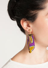 Pendientes maxi con pieza colgante textil ovalada. Cierre en forma de botón en zamak con baño de oro