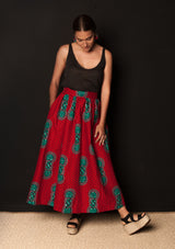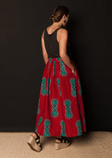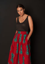 Este estampado de fondo rojo vibrante presenta motivos de aspas azules y blancas que, combinadas, forman círculos que se repiten al infinito. Muy popular en África occidental, este tipo de diseños geométricos se encuentran en muchos repertorios decorativos tradicionales, como el de los Igbo de Nigeria o el de los Kasena de Burkina Faso, por dar solo dos ejemplos.