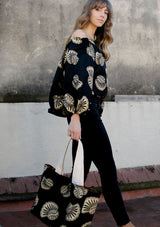 Los acabados sobreimpresos en dorado se han hecho muy populares, en estos últimos años, en los estampados wax. No solo aportan un efecto premium sino que remiten a la importancia otorgada tradicionalmente al oro como signo de prestigio. En este estampado, los motivos dorados representan flores con multitud de pétalos, que también podrían verse como soles. El fondo presenta una alternancia de diseños florales de inspiración indonesia y motivos geométricos.