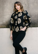 Blusa de corte evasé con hombros al descubierto. Elástico revestido con ribete de volantes en la parte superior y mangas tres cuartos abullonadas con remate elástico oculto.