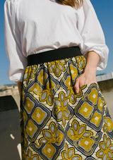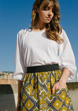 Vibrante y atrevido en su combinación de tonos amarillo, rojo y azul marino sobre fondo blanco, este estampado floral recuerda el origen indonesio de las telas wax.