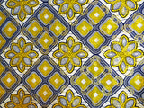 La combinación de motivos naranja sobre fondo azul eléctrico resulta muy popular en África y menudo se encuentra en los tejidos wax. En este estampado, el dibujo es una pequeña flor de cinco pétalos estilizados.