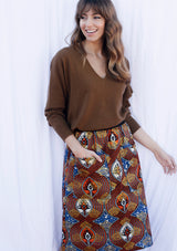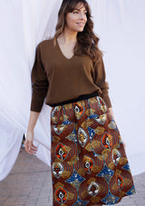 Falda de corte evasé y largo midiCintura elástica ancha y  de talle alto. Bolsillos delanteros.