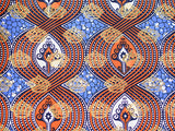 La combinación de motivos naranja sobre fondo azul eléctrico resulta muy popular en África y menudo se encuentra en los tejidos wax. En este estampado, el dibujo es una pequeña flor de cinco pétalos estilizados.
