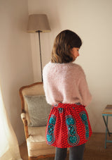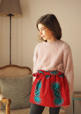 Falda acampanada con cintura elástica y fruncido superior. Cinturón de lazo