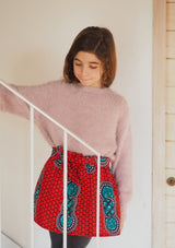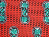 Este estampado de fondo rojo vibrante presenta motivos de aspas azules y blancas que, combinadas, forman círculos que se repiten al infinito. Muy popular en África occidental, este tipo de diseños geométricos se encuentran en muchos repertorios decorativos tradicionales, como el de los Igbo de Nigeria o el de los Kasena de Burkina Faso, por dar solo dos ejemplos.