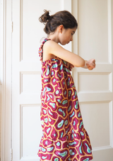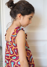 El gusto de los habitantes del norte de Nigeria por los tejidos claros y los decorados geométricos sirvieron de inspiración para el diseño de este estampado de cubos rojos, marrones y morados.