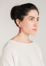 Pendientes con largo colgante textil rectangular. Cierre de zamak, disponible con baño de oro o plata