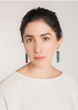 Pendientes con largo colgante textil rectangular. Cierre de zamak, disponible con baño de oro o plata