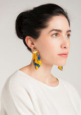Pendientes maxi con pieza colgante textil ovalada. Cierre de zamak con baño de oro