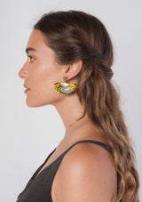 Pendientes maxi con pieza colgante textil en forma de media luna. Cierre de zamak con baño de oro o plata a escoger