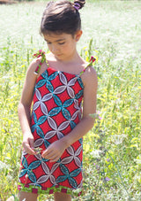 Este estampado de fondo rojo vibrante presenta motivos de aspas azules y blancas que, combinadas, forman círculos que se repiten al infinito. Muy popular en África occidental, este tipo de diseños geométricos se encuentran en muchos repertorios decorativos tradicionales, como el de los Igbo de Nigeria o el de los Kasena de Burkina Faso, por dar solo dos ejemplos.