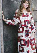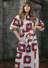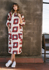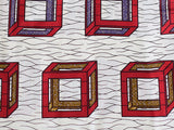 El gusto de los habitantes del norte de Nigeria por los tejidos claros y los decorados geométricos sirvieron de inspiración para el diseño de este estampado de cubos rojos, marrones y morados.